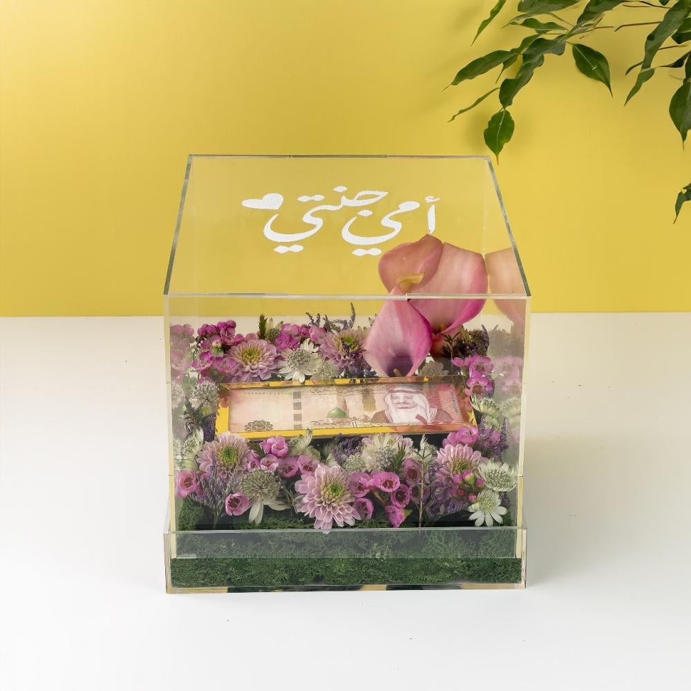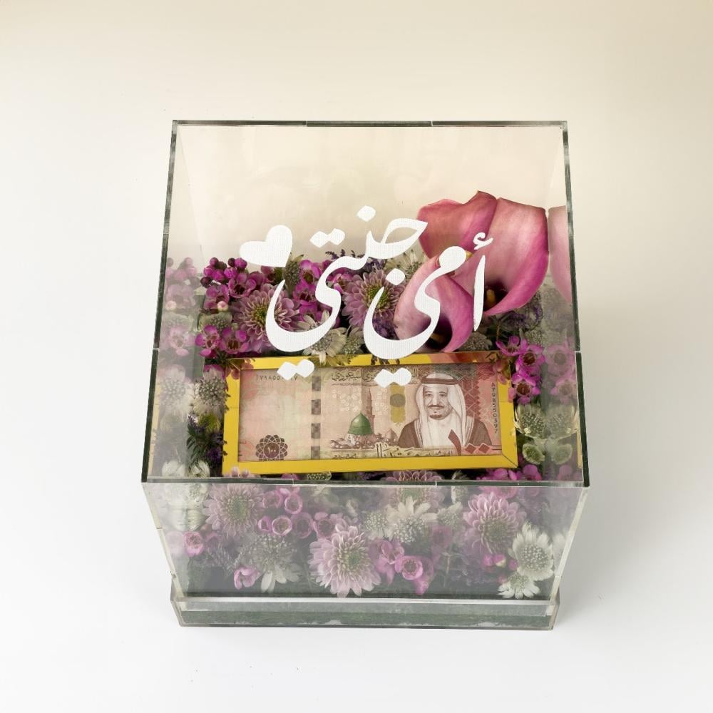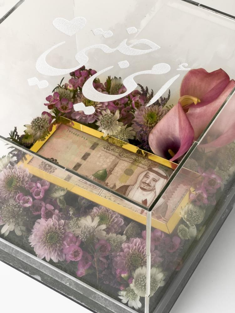 عن المنتج : صندوق اكريلك مزين بالزهور الطبيعية الانيقة مع ظرف لاضافة مبلغ مالي