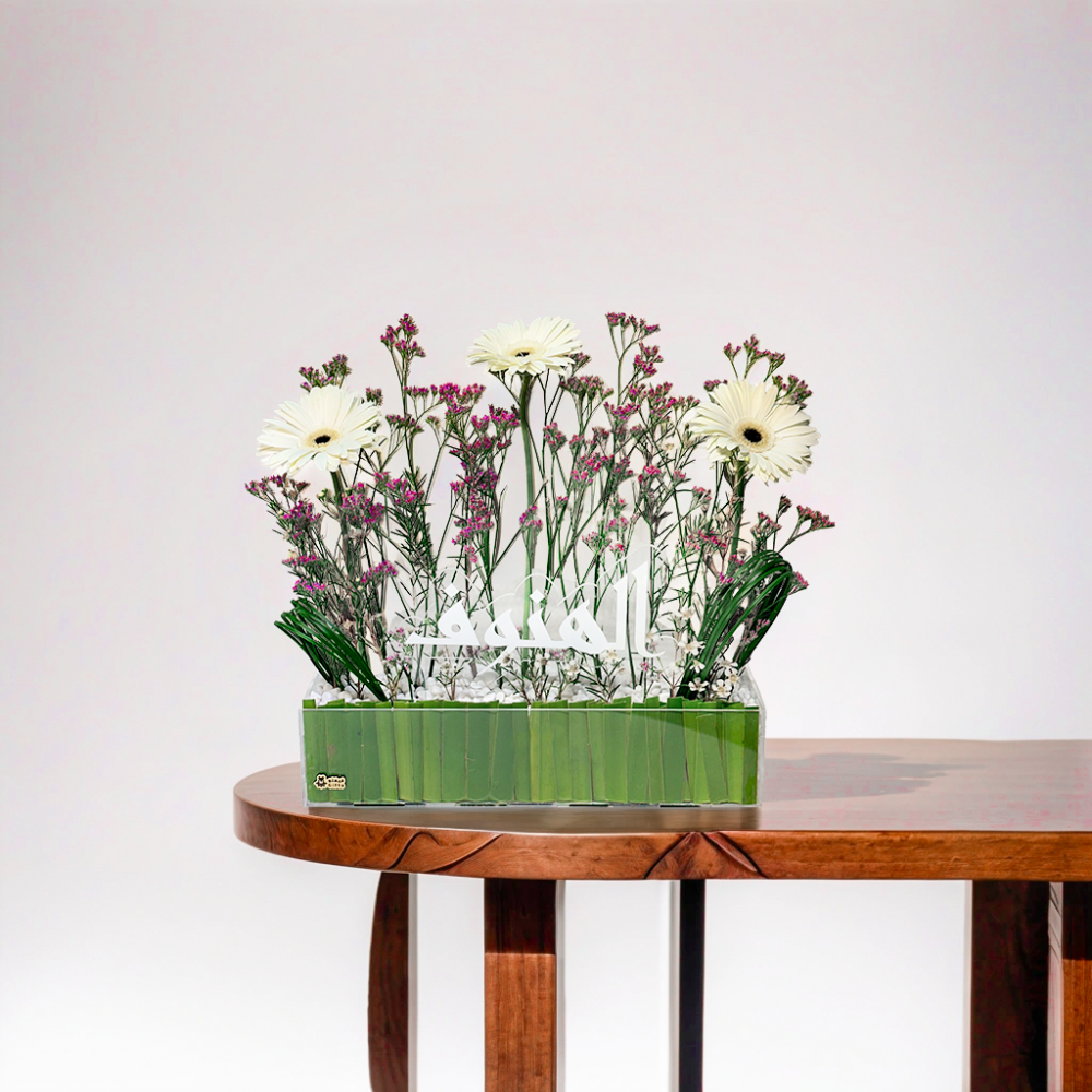 عن المنتج: قاعدة اكريلك منسقة بمجموعة من الزهور الطبيعية مع اسم اكريلك
