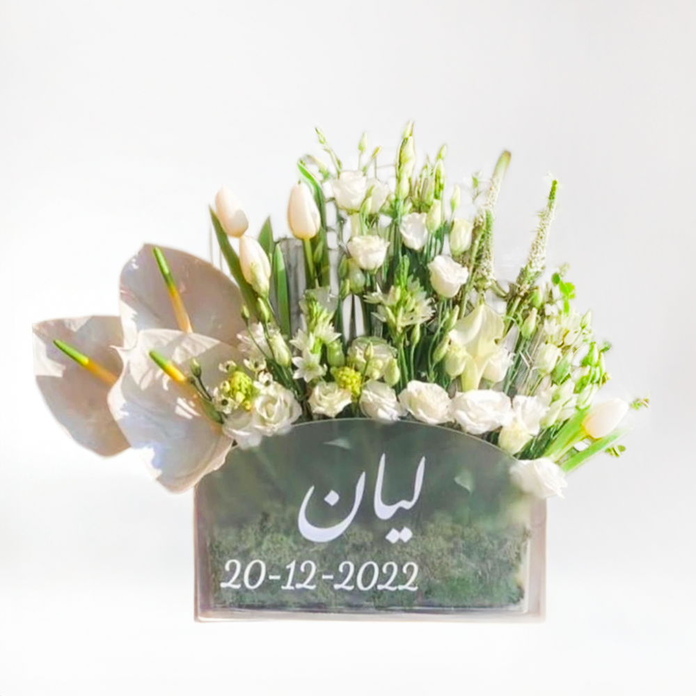 عن المنتج: بوكس اكريلك منسق بمجموعة من الزهور الطبيعية مع اسم من اختيارك