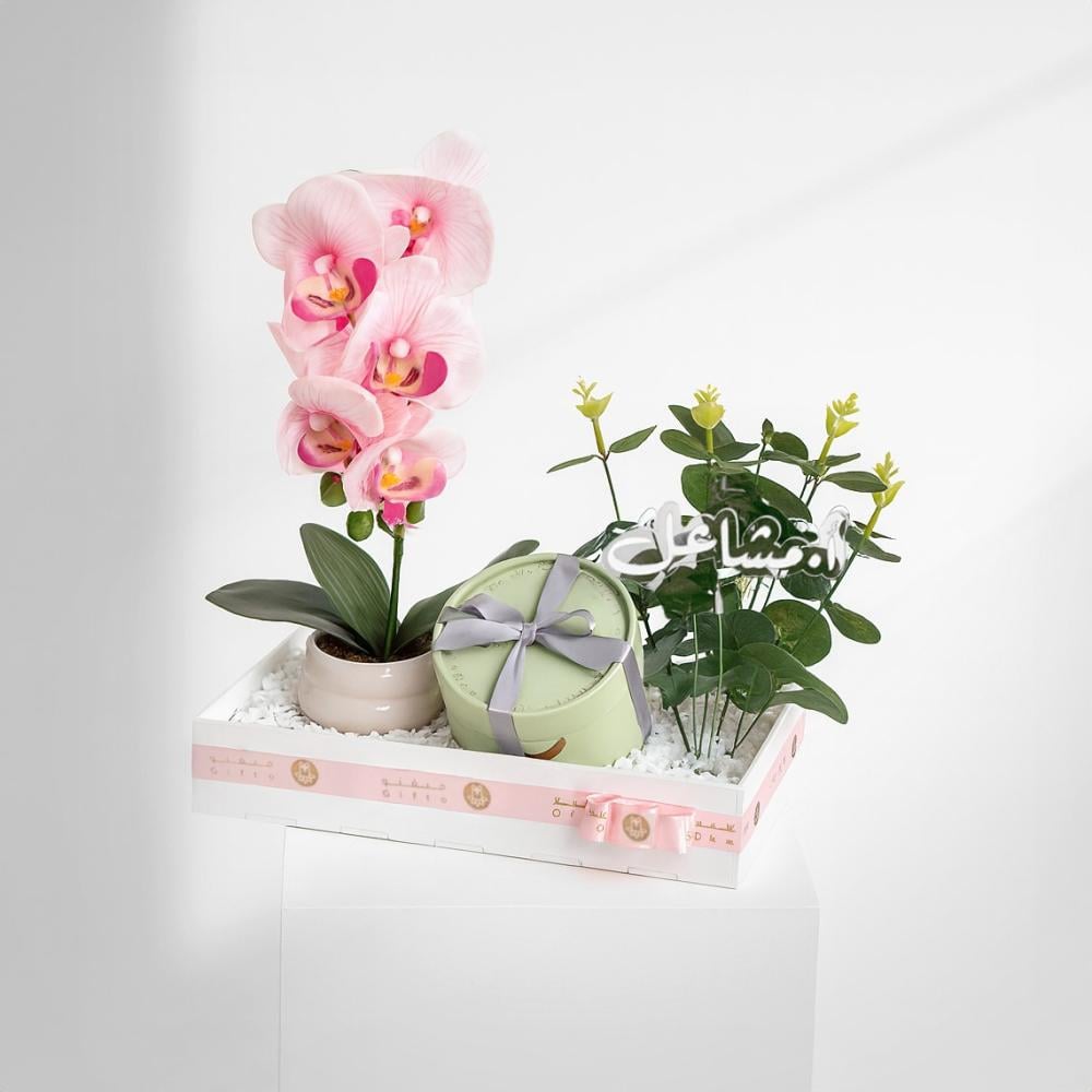 عن المنتج : قاعدة اكريلك بفازة مكتب من الاوركيد الفاخر بالاضافة لتغريسة اسم و تشوكلت انوش