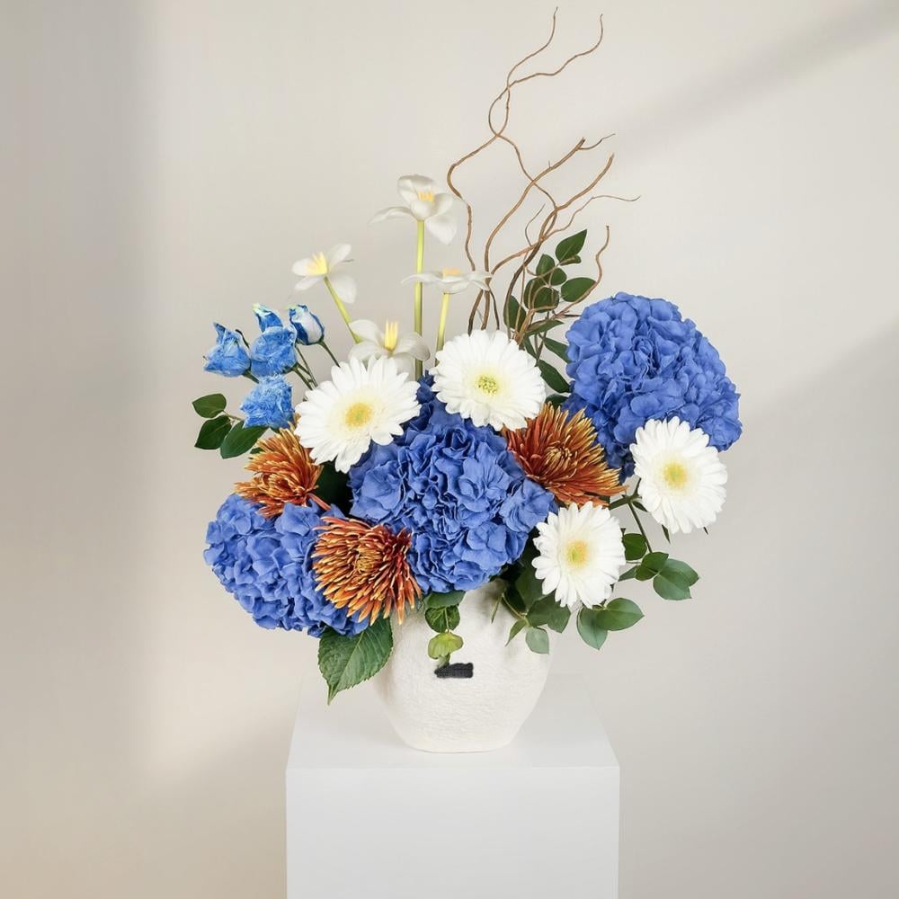 عن المنتج : فازة رخاميه منسقة بمجموعة من الزهور الهولندبه الفاخره بالون صيفية