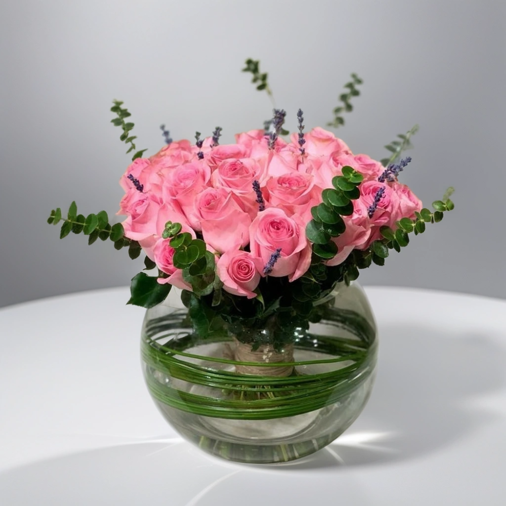 عن المنتج :فازة منسقة بمجموعة من زهور الجوري الفاخرة مع اغصان الاكليبتوس