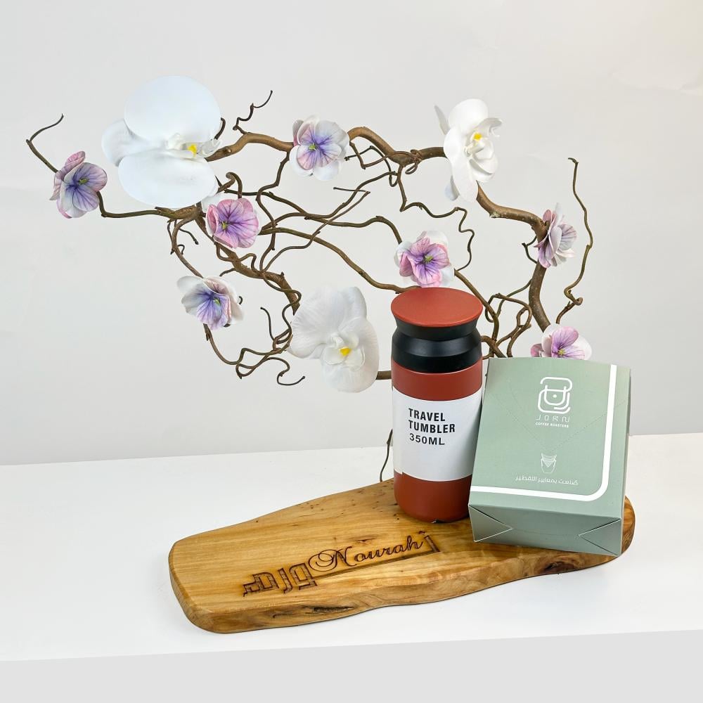 عن المنتج: قاعدة خشبية منسقة مع كوب حراري واظرف قهوة مع نحت الاسم باليزر بالضافة الى مجموعة زهور صناعية