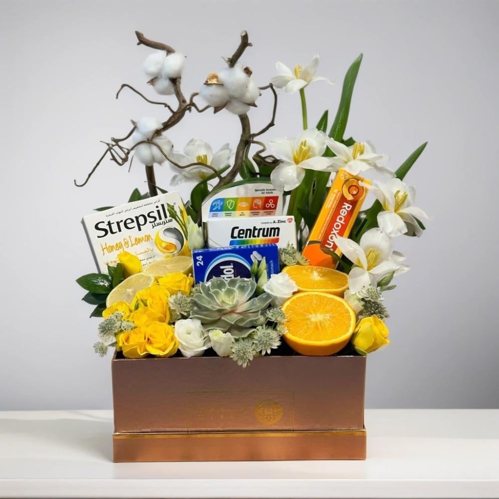 عن المنتج: صندوق قيفتو منسق بالزهور الطبيعية مع ادوية وبرتقال وليمون