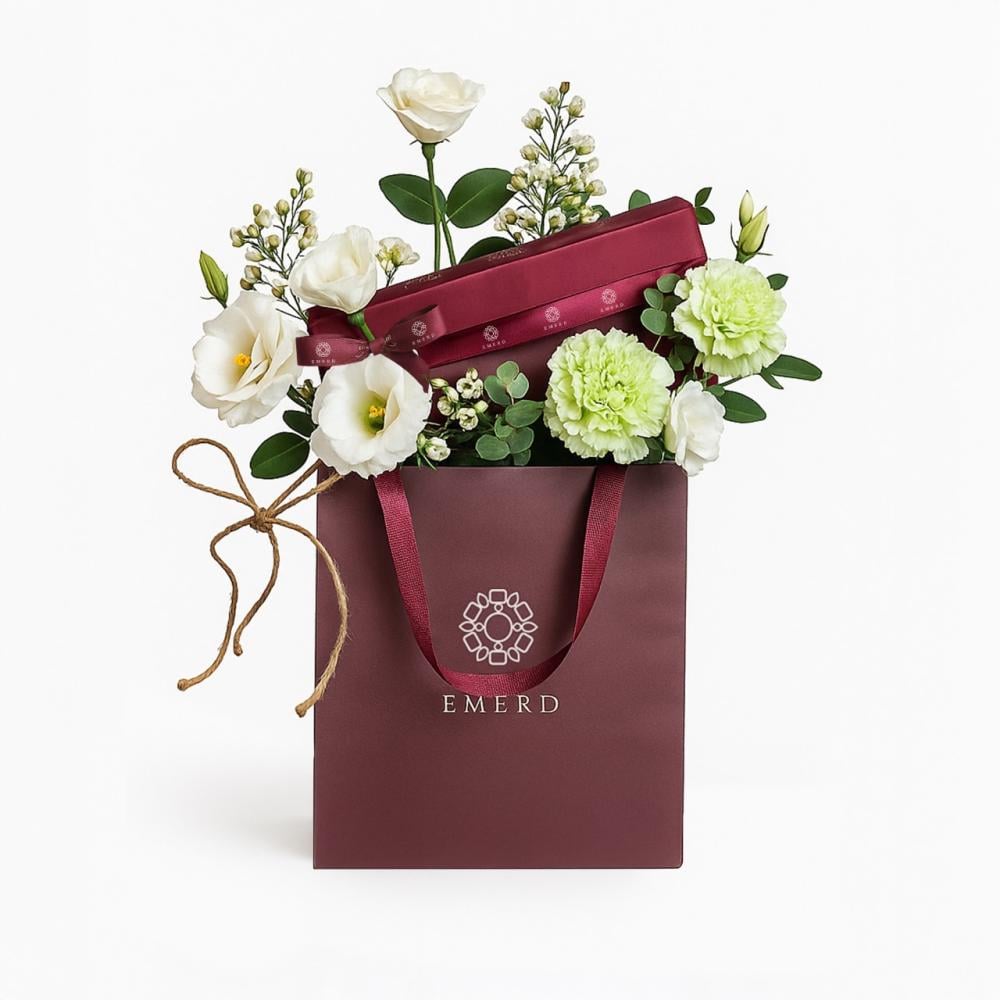 عن المنتج :مجوهرات منسقه بمجموعه من الزهور الطبيعيه في كيس البراند الخاص قطعه مميزه مصممه بشكل عصري مطلية ذهب ومرصعه بالألماس